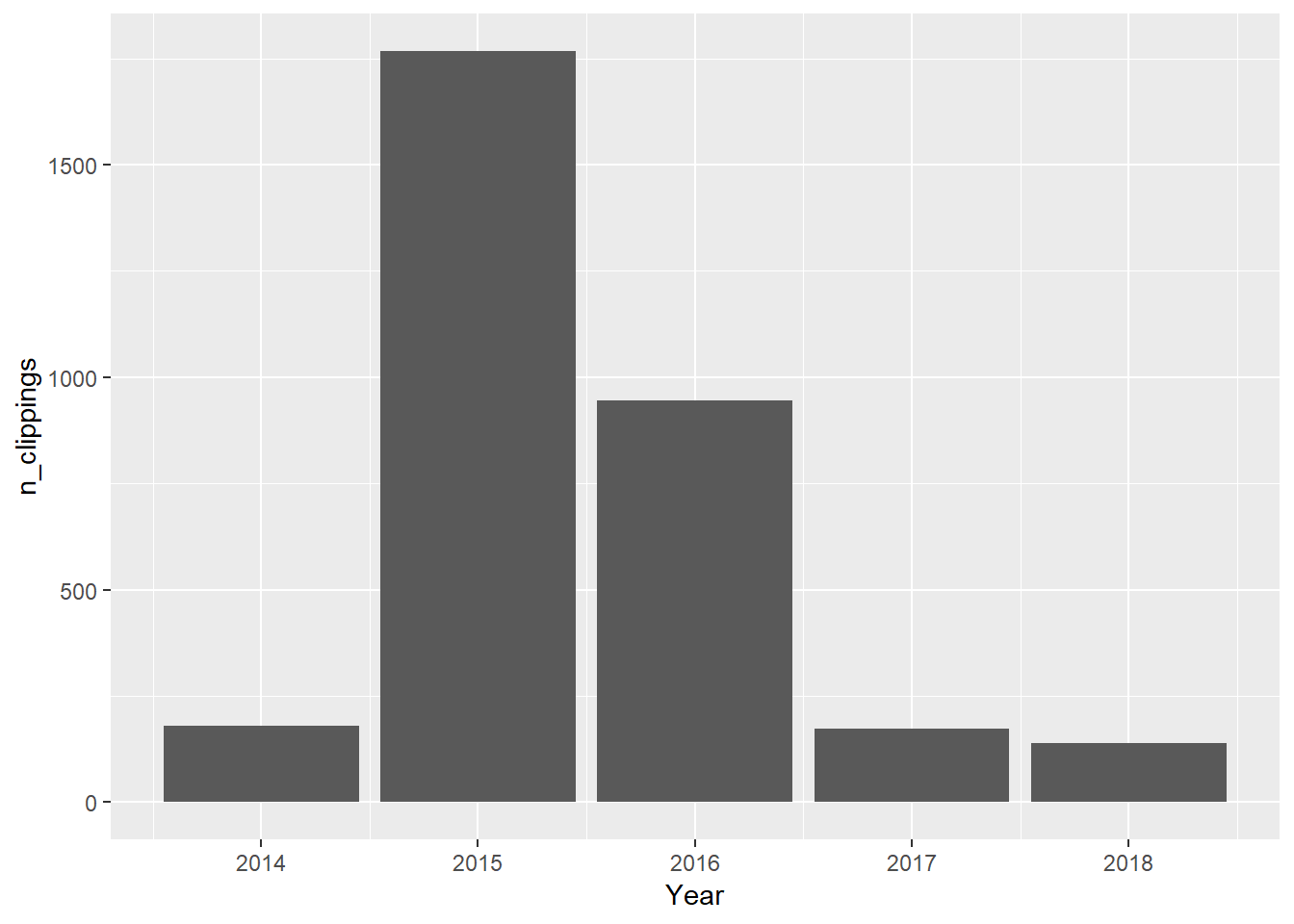 ggplot(aes(x=Year, y=n_clippings)) + geom_col()