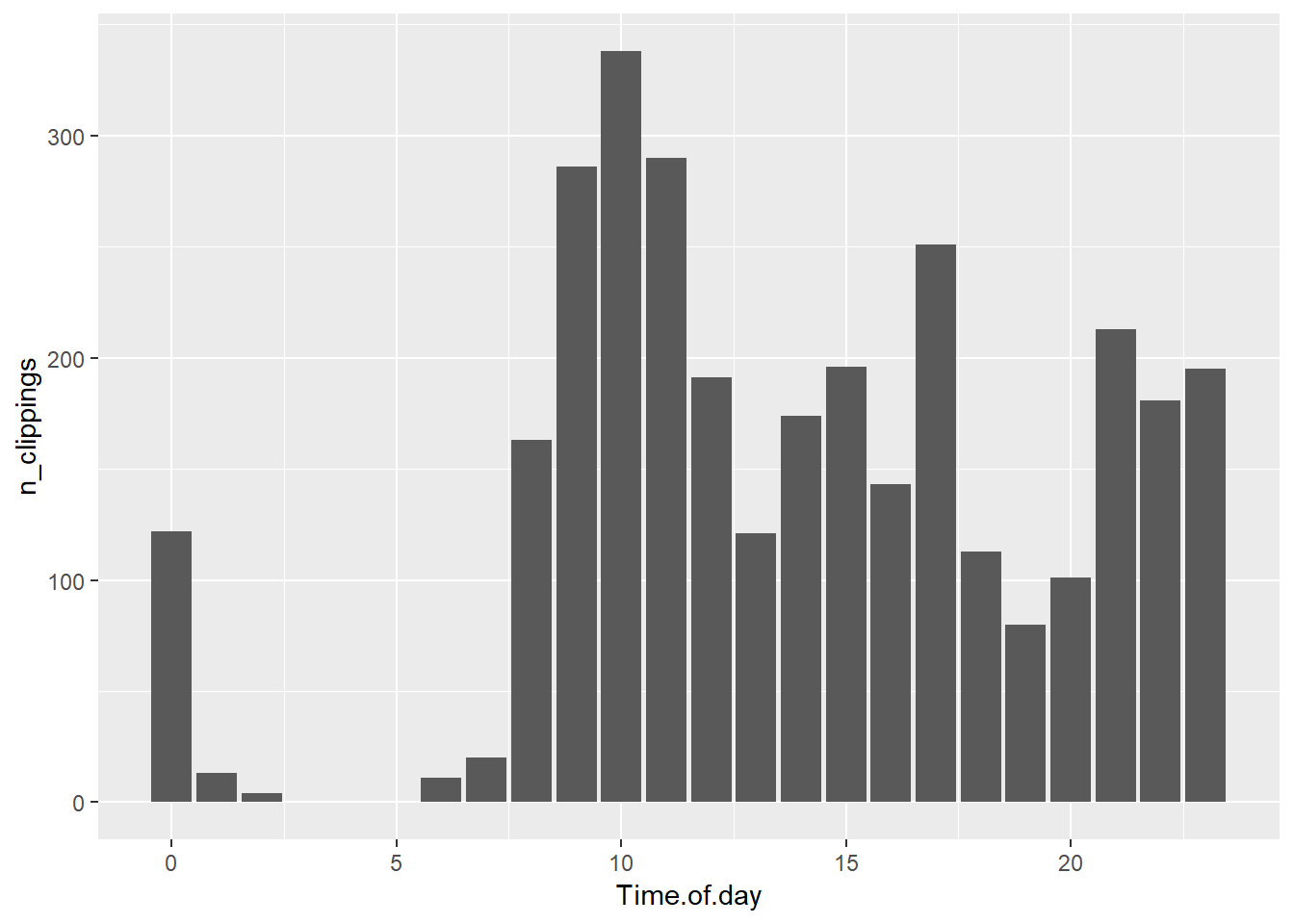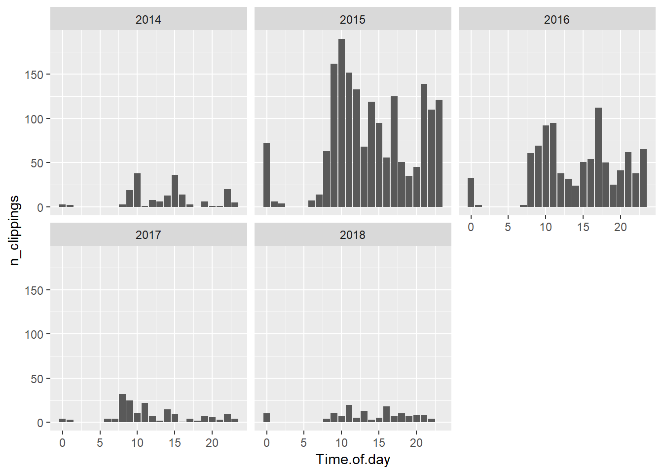 clippings <- clippings %>% mutate(Year = year(`Date/Time`), Time.of.day = hour(`Date/Time`))